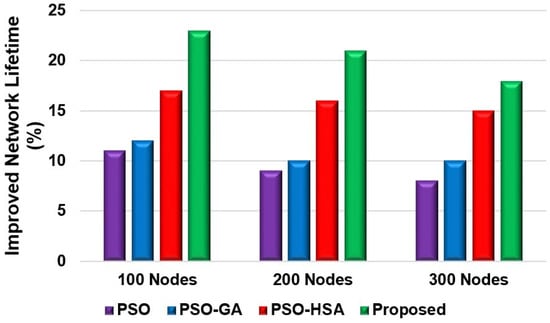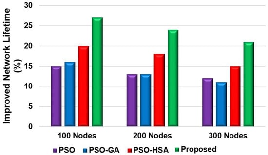 Figure 10 shows the total packets received by the BS. Scenario 2 considered 200 nodes for this evaluation. More than 18,000 packets were received by the BS for the proposed model. However, the LEACH and DEEC models could not send as many packets compared to the PSO model. The proposed model sent over 12,000 more packets than the LEACH and DEEC models and 4000 more packets than the PSO model. The reason for this is that the proposed model’s fitness function preserves the nodes’ residual energy, which extends their lifetime. This enhances network lifetime and increases the number of packets transmitted to the BS. Figure 11 shows the packet-drop ratio for Scenario 2 with varying numbers of nodes. The proposed model achieved a lower packet-drop ratio compared to the other models. The LEACH and DEEC models had significantly higher packet-drop ratios for different node numbers compared to the proposed model. The packet-drop ratio for the proposed model increased by approximately 5% with the addition of 100 nodes. The proposed fitness function helps minimise data transfer drops as the model selects energy-efficient paths to send the data. However, the PSO model achieved a lower drop ratio because of the routing efficiency. Nevertheless, due to the inefficient selection of CHs and routing paths, the LEACH and DEEC models achieved higher packet-drop ratios. Figure 12 and Figure 13 show the percentage improvement in network lifetime for the proposed model in Scenario 1 and Scenario 2, respectively. The proposed model is compared with the state-of-the-art PSO and hybrid models. The proposed model significantly improved network lifetime, increasing by 27%, 24%, and 21% in Scenario 1 for 100, 200, and 300 nodes, respectively. In Scenario 2 (Figure 13), the proposed model achieved increases of 23%, 21%, and 17% for 100, 200 and 300 nodes. The proposed model achieved a higher network lifetime compared to the other state-of-the-art models, with the network lifetime increasing by approximately 10%. This is due to the efficient CH selection process, which reduces node energy consumption during packet transmission and finds the optimised route for packet delivery.