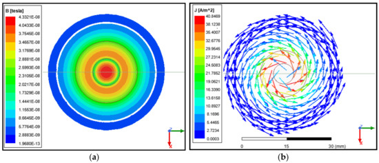ANSYS eddy current simulation of the designed probe, where (a) shows the magnetic field distribution and (b) shows the eddy current distribution under the coil.