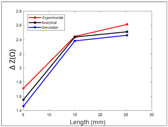 The values obtained from the experimental results were higher than the ones obtained from the simulation and analytical modeling. The longer the length of the defect, the greater the change in the coil impedance. At a defect length of 25.2 mm, there was a higher value representing the coil impedance change compared to the values obtained at defect lengths of 15 mm and 5 mm. For defect lengths of 15 mm and 25 mm the simulation results were better since the mesh size used in the simulation was suitable and big enough compared to the defect size, which gave more accurate results. Several simulation models were run with different mesh sizes for mesh analysis. In cases of small defect sizes, the mesh size had to be very small to get better simulation results, which requires more computational power and a longer simulation time. More elaboration can be seen in Section 3.4 for all experiments.