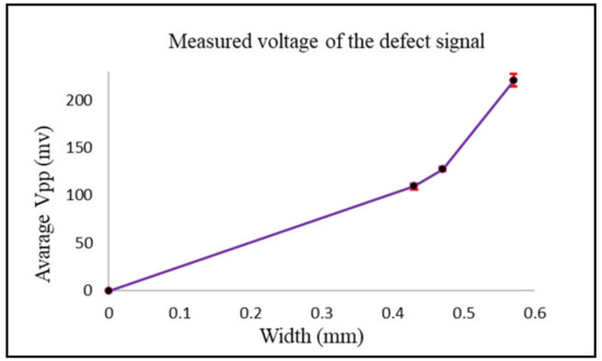 Figure 14 shows the measured peak-to-peak voltage value for each defect. To get better and accurate results, a total of six readings were taken for each defect. The probe sweep direction with respect to the location of the defects is shown in Figure 13. The standard deviation and the average of all readings were calculated. The RMS values of the average measured peak-to-peak voltage of each defect were the ones used in Figure 15, where they are represented in terms of impedance (ΔZ).