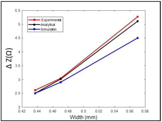 The values obtained from the simulation were lower than the ones obtained from the analytical and experimental results. The higher the width of the defect, the higher the change in the coil impedance. At a defect width of 0.57 mm, there was a higher value representing the coil impedance change compared to the values obtained from the defects with widths of 0.47 mm and 0.43 mm. Also, there was no big difference in the values obtained from the 0.47 mm defect width compared to the ones obtained from the 0.43 mm defect width since there was no big difference between both widths.
