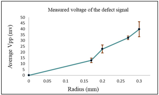 Figure 17 shows the measured peak-to-peak voltage value for each defect. To get better and accurate results, multiple readings were taken for each defect. The standard deviation and the average of all readings were calculated. The RMS values of the average measured peak-to-peak voltage of each defect were the ones used in Figure 18, where they are represented in terms of impedance (ΔZ).