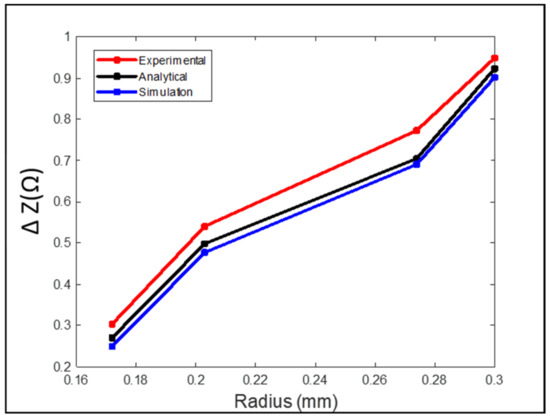 where is the resistance and is the inductive reactance, is the current, the peak-to-peak voltage (Vpp) is 3.4 V and the RMS value of it s 1.202 V. So, the measured impedance value of the coil using Equation (8) was 1.202/0.0148 = 81.2 Ω. In analytical modeling, the general expression for the change of coil impedance on top of a multi-layer structure is derived using Equation (9).