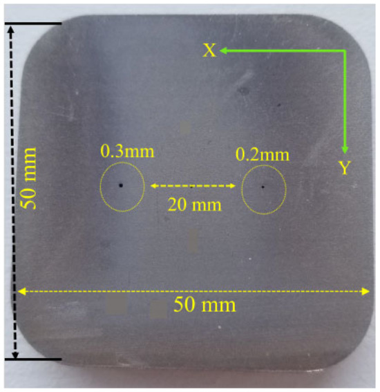 The test for the designed probe was to detect four blind holes with diameters of 0.34 mm, 0.4 mm, 0.54 mm, and 0.6 mm. The four blind holes were 0.5 mm from the surface of the plate and had a depth of 1.5 mm. The plate thickness was 2 mm, as shown in Figure 16. Detection was carried out from the opposite side of the blind holes to simulate subsurface pores inside the material. Results were compared to the simulation model that was created using ANSYS Maxwell and analytical modeling.