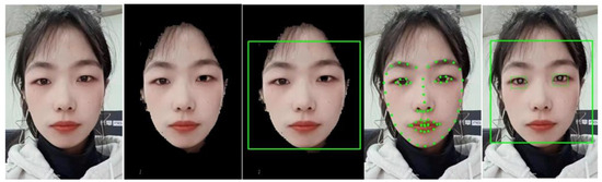 Extraction of facial features and eye features. The first is the original image, the second is the image which remove pixels other than skin color, the third is the result of face detection, the fourth is the detection of face alignment, and the fifth is the result of pupil center positioning.