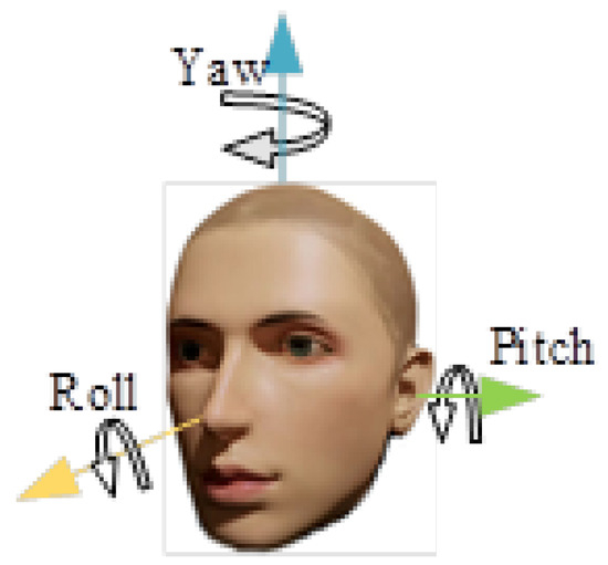 In 3D space, the head pose can be represented by three Euler angles of pitch, yaw, and roll, as shown in Figure 3. The head pose is used for gaze tracking. We used the general head 3D model [37], and obtained the conversion formula from the screen coordinate system to the world coordinate system using the EPnP algorithm [43,44]. The EPnP algorithm is used to compute the camera pose, and it estimates the position and orientation of the camera relative to an object using known 3D points on the object and their corresponding 2D projection points in the image, the camera pose is represented by a rotation matrix R and a translation matrix T. The relationship between the 3D points on the object and their corresponding 2D points in the image can be described by Equation (3); by substituting specific points, we can obtain the rotation matrix R and translation matrix T.