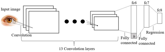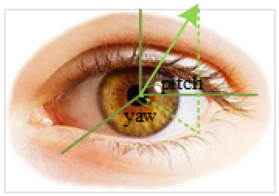 The next step is to estimate the gaze direction, which is to judge the gaze direction from the captured video frames. The direction can be described by pitch and yaw, as shown in Figure 4. We use the GazeNet [37] to estimate it, as shown in Figure 5 along with the CNN network architecture. The network extracts deep appearance features based on the VGG-16 deep convolutional neural network [45]. This is a way that estimates the gaze of one eye, that is, the gaze directions of the two eyes are estimated separately.