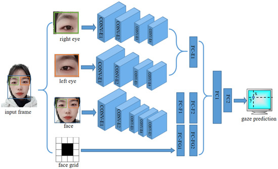The last step is gaze point estimation. The gaze point estimation serves to estimate the point where the gaze is focused on a two-dimensional plane. This plane can be a mobile phone, pad, computer, etc. We implemented this task using the iTracker [38] network. iTracker is a convolutional neural network for eye-tracking. The overall architecture of the network is shown in Figure 6. Although the face image already contains the eyes, the eye image is still used as a separate input to obtain a more accurate image.