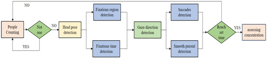 The process of evaluating attention. Firstly, identify the number of people in the image, if the number is not one, then re-identify. Secondly, the eye movement data, including the user’s gaze range, gaze time, gaze direction, number of saccades, and reading smooth pursuit times are counted for a period of time, and the user’s attention is evaluated through these data.