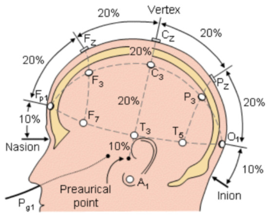 As shown in Figure 10, the 10–20 system divides the head into regions, where 10% and 20% represent the relative proportions of the distance from the head suture to the tip of the nose and the posterior cranial eminence to the virtual vertical line.
