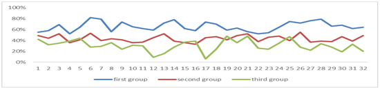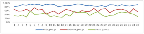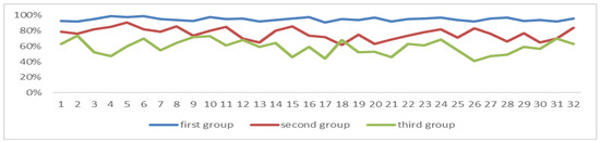 Among the three groups of students, the correlation coefficient between POSEFT and the degree of attention is 0.8646, and there is a significant relationship between the two (p = 0.01), and the data in the first group are all greater than 50%, as can be seen in Figure 16.