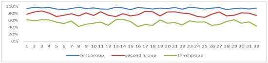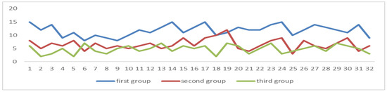 Among the three groups of students, the correlation coefficient between the NORSP and the degree of attention is 0.7687, there is a significant relationship between the two (p = 0.01), and the average of NORSP per ten minutes in the first group is greater than 5, as can be seen in Figure 18.