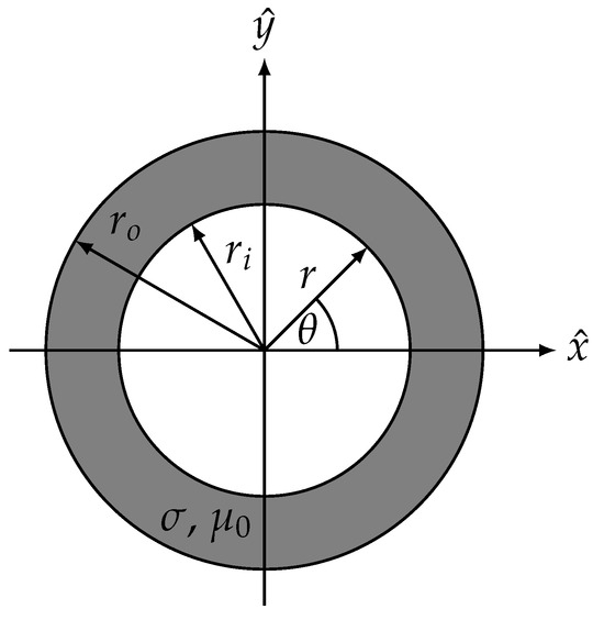 To investigate the shielding effect of a surgical instrument, we approximate it as an infinite cylindrical rod with inner radius , outer radius and conductivity . Such a cylindrical rod can be seen in Figure 1. We adopt the obvious choice of a cylindrical coordinate system with the rod axis oriented along the z axis. In light of (3), we introduce a magnetic vector potential such that