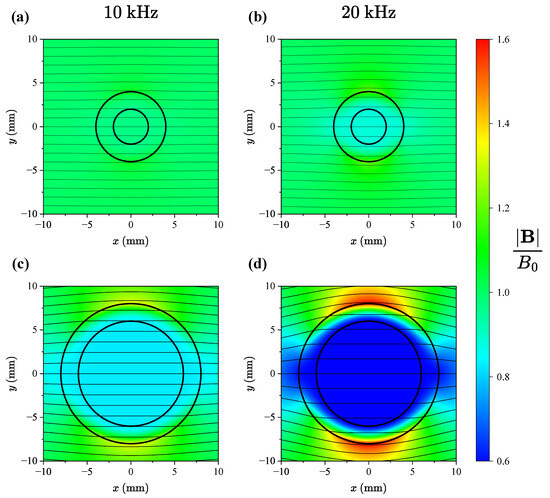 The normalised magnitude of the magnetic flux density for two different excitation frequencies for a conductivity of MS/m. In subfigures (a) and (b), we have 2 mm and 4 mm, while in subfigures (c) and (d), we have 6 mm and 8 mm.