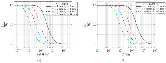 By using Equation (5), we can obtain the complete solution for the magnetic flux density in each region of the domain. The normalised magnitude of the magnetic flux density can be seen in Figure 2. We have evaluated the solution for two different rod geometries for two different frequencies of the externally applied field. As we are primarily interested in the magnetic flux density within the rod, we now turn our attention to the solution in the innermost region. For , we have