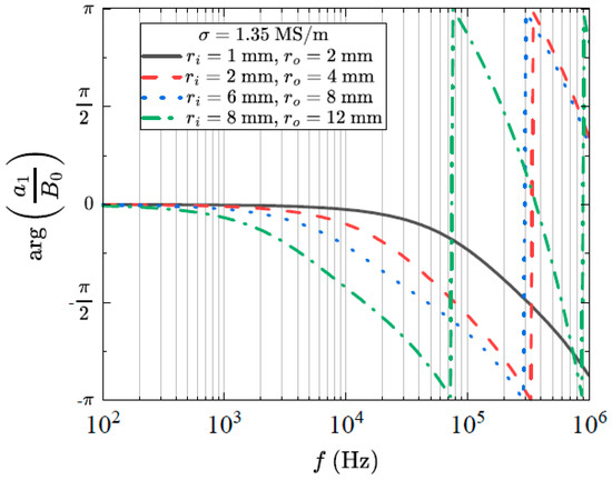 The phase difference between the magnetic flux density inside and outside the rod as a function of frequency for a number of different rod geometries.