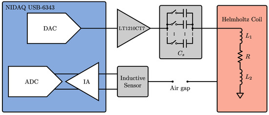 where and are the self-inductances of each of the coils, respectively, and is the chosen series capacitance. A schematic of the circuit used to drive the Helmholtz coil can be seen in Figure 5. A National Instruments USB-6343 data acquisition unit is used to drive the sinusoidal signal, which is then amplified using an LT1210CT7 power amplifier. A relay-switched capacitor bank is used to select the value of the series capacitor. The capacitance is chosen such that the circuit is driven as close as possible to resonance. The generated field was verified using a calibrated triaxial magnetic field probe (ELT-400, Narda Safety Test Solutions GmbH, Pfullingen, Germany).