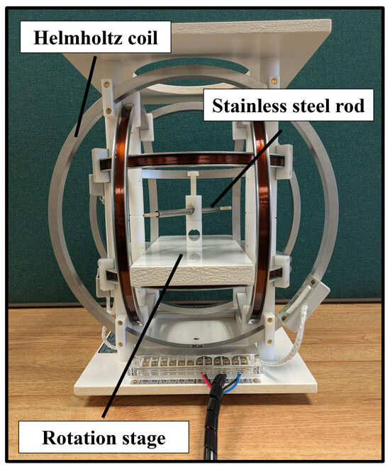 Using the Helmholtz coil, a homogeneous field was then driven at a given frequency f. The inductive sensor was aligned parallel to the magnetic field and, without any metallic rods present, the voltage induced across the sensor was measured. Measurements were taken over an interval of twenty seconds at a sampling rate of 250 kS/s. This voltage was validated to be linear in both frequency and applied magnetic field strength for the region of interest. Next, the inductive sensor was fixed axially within the centre of each stainless steel rod. The rod was placed into the Helmholtz coil with an angle between the sensor axis and the driven magnetic field. The corresponding voltage was measured. This was repeated for frequencies from 4 kHz to 60 kHz and angles of , and . The experimental setup can be seen in Figure 6. To determine the shielding effect of the rod, we are interested in the ratio , where is the amplitude of the magnetic flux density within rod i and is the amplitude of the magnetic flux density during the control measurement when no rod is present. To obtain the magnitude of the field, we take the FFT of the the measured voltage signal and extract the amplitude corresponding to the frequency of the driven magnetic field.