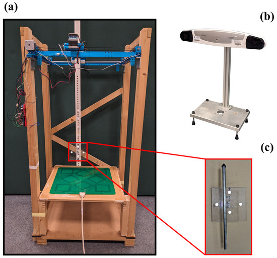 The experimental setup with (a) the robotic positioning system, (b) the optical tracking system and (c) the optical tool with IR markers and the stainless steel rod and sensor rigidly attached.