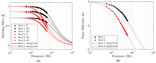 Experimental measurements of (a) the shielding effect and (b) induced phase for the two stainless steel rods. Analytical results given by (32) are denoted by solid curves.