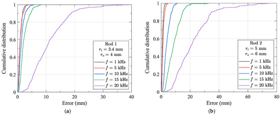 The cumulative distribution of the tracking errors with a sensor fixed within (a) rod 1 and (b) rod 2.