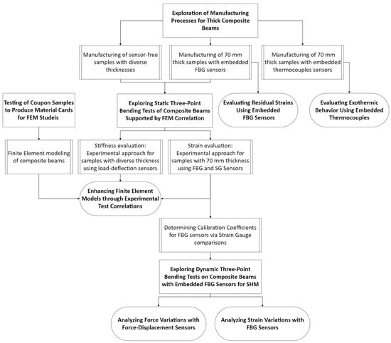 This research comprehensively explores the lifecycle of a large-scale laminated ComBeam from its manufacturing stage to physical testing with the help of surface mounted or embedded sensors such as FBGs, SGs, and TCs. Figure 1 presents the detailed workflow of this study. The focus of this study is on the robustness of thick laminated ComBeams, which are crucial for the development of composite leaf springs for HCVs. Unlike prevalent research trends that often concentrate on smaller, coupon-sized specimens, our study emphasizes full-scale composite structures. By expanding this research to include larger structures, size-related factors that significantly influence the mechanical properties of composite materials are addressed and elucidated, as these factors are frequently overlooked in smaller-scale studies.