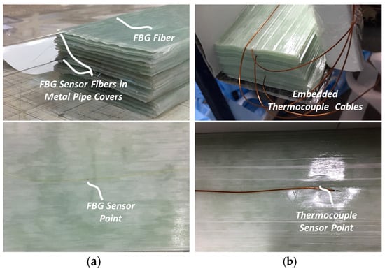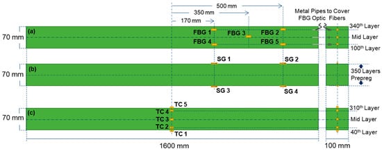 In this study, FBG sensors and TCs were separately integrated into different samples of thick ComBeams with the same dimensions. Single mode polyamide coated FBG sensors with the grating length of 1 mm were purchased from TECHNICA (Atlanta, GA, USA). The ComBeams were produced through using a glass/epoxy 300 Grams per Square Metre (GSM) prepreg, manufactured by Kordsa (Istanbul, Türkiye) with the product name of OM11. The OM11 prepreg is made of unidirectional (UD) E-glass fiber and a hotmelt epoxy resin system with a fiber weight content of 65%. The non-cure ply thickness of the prepreg was measured to be 0.25 mm. For production, the prepregs with a width of 600 mm were cut to strip dimensions of 96 mm in width and 1,595 mm in length using a ZUND Digital Cutter (Zünd Systemtechnik AG., Altstätten, Switzerland). Cut prepregs were hand laid into preforming fixtures to avoid any fiber misalignments along the length of the ComBeams. The total number of laminates was 260, 280, or 350 per ComBeam. All sensors shown in Figure 2 were used for the ComBeam samples with 350 laminates. FBG sensors were strategically embedded between the selected layers during the prepreg layer placement as can be seen in Figure 2a and Figure 3a.