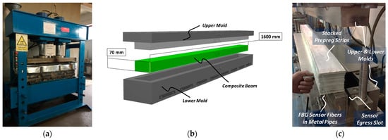 The manufacturing of the beams was conducted using a compression molding method with an oil heated press, as depicted in Figure 4a. After preparing the surface of mold using Axel Xtend-838 mold cleaner (Axel Plastics Research Laboratories, Inc., Monroe, CT, USA), already stacked prepreg strips were placed into the lower mold cavity, as shown in Figure 4b. The mold was specially designed to allow the egress of the FBG sensors and TCs without damage, as seen in Figure 4c. The manufacturing process began with preheating the empty mold to 120 °C, followed by placing the prepreg stacks into the lower mold cavity, closing the upper mold, and consolidating the part under a molding pressure of 125 bars (2000 kN). After molding, the ComBeams were demolded and post-cured in an oven at 110 °C for 10 h to alleviate residual stress within the structure.