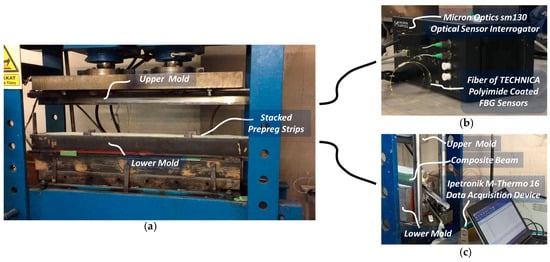 Manufacturing process and data acquisition systems: (a) hot compression molding with stacked prepreg strips, (b) Micron Optics sm130 retrieving strain and temperature data from FBG sensors, and (c) Ipetronik M-Thermo 16 measuring temperature from embedded TCs.