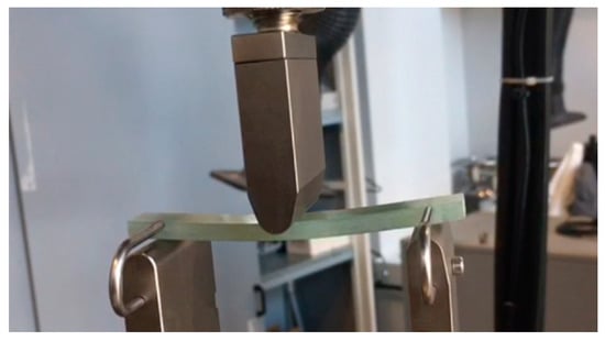 The stiffness of PMC coupons was evaluated through employing a three-point bending test, conforming to American Society for Testing and Materials (ASTM) D790 standards []. The coupon samples, dimensioned at 100 mm in length, 15.26 mm in width, and 5.20 mm in thickness (26 layers of UD prepreg), underwent testing utilizing an Instron 5982 universal testing platform (Instron, Norwood, MA, USA) as depicted in Figure 6. The test setup incorporated an 80 mm span for support, with an applied force of 2763 N representing 80% of the ultimate tensile strength of 300 GSM OM11 Prepreg, at a constant frequency of 1 Hz.