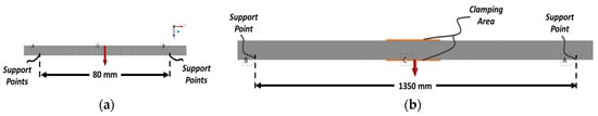 FE models correlating with physical test conditions. Points A and B represent the support areas, while point C indicates the location where the force is applied. (a) Depicts a coupon sample in accordance with ASTM D790 standards [], and (b) shows a real-sized ComBeam, both designed to mirror the experimental setup for accurate simulation of the physical tests.