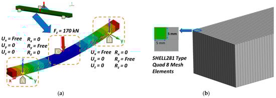 FE model setup for ComBeam samples. (a) Demonstrates the boundary conditions aligned with physical test constraints with support points. (b) Showcases the model’s precision meshing using 5 mm × 5 mm sized SHELL281 type Quad 8 elements.