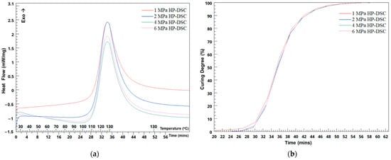 Thermal behavior and curing process of the OM11 resin system under varying pressures via HP-DSC. (a) Minor heat flow variations with increasing pressure, indicating a consistent thermal response. (b) The average degree of curing remains unaffected by pressure changes, underscoring the stable curing characteristics of the resin across different pressure levels.
