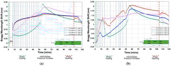 Figure 12 presents two different consolidation procedures and their effect on the recorded FBG sensor data in terms of ΔλB, for ComBeam samples 5 and 6 during the curing stage. Each plot represents the shift for individual sensors (FBG 1 to FBG 4), indicating the response of the material to thermal and mechanical stresses throughout the process. These shifts are directly related to the increase in the applied pressure by the hydraulic press and to the temperature changes during the process (mold heating and exothermic reaction), as well as the possible residual strain formation as a result of the curing reactions. The vertical lines in Figure 12 indicate press movements, including press closing, intermediate pressure increases, and press opening times, all correlated with the timing of the ΔλB. The inset figures provide the location of the sensors within the ComBeams. For the curing process of ComBeam 5 (Figure 12a), the force is initially applied at 750 kN and then increased to 2000 kN after 5 min. In contrast, ComBeam 6 (Figure 12b) is directly compressed with 2000 kN without any initial force.