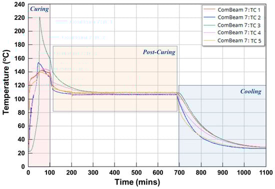 Temperature measurements from the TCs during the curing, post-curing, and cooling phases of ComBeam 7 are presented in Figure 13. In this figure, the temperature changes of each TC are different due to factors such as the low thermal conductivity coefficient and the exothermic reaction characteristics of the OM11 resin system. Additionally, there is a temperature difference of around 5 °C between the upper and lower molds. Although the molds are set to 130 °C, the ComBeam samples reach over 200 °C due to the heat generated during the exothermic reaction, which is not transferred out of the thick composite structure because of the resin system’s low thermal conductivity coefficient. After the curing phases, temperature homogenization during the post-curing phase and a slow decrease in temperature towards ambient conditions during the cooling phase, can be observed in Figure 13. This temperature profile is important as it represents the internal thermal gradient, which governs the rate and extent of the cross-linking reactions critical to the curing of the matrix.
