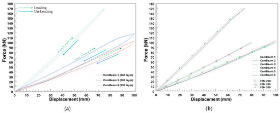 Force-displacement results; (a) Force-displacement curves for thick ComBeam samples and (b) Comparison of FE simulations with experimental stiffness measurements under specified loading conditions.