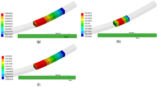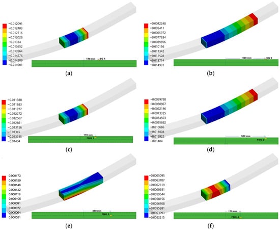 The detailed CCs calculated influence the post-processing of the raw data collected by the FBG sensors to ensure that the measured strain values closely match those from surface mounted SGs and the FE model theoretical predictions presented in Table 8. This calibration process, essential for mitigating the effects of external influences such as temperature changes and mechanical stress during the embedding process, requires a comprehensive approach for proper SHM. The calibration strategy, developed through in-depth analysis and empirical data, including the strain results from the FE analysis, represents a systematic iteration to improve sensor accuracy through methodical changes and subsequent validations [,,]. Advancements in structural engineering rely on this diligent approach for reliable strain measurements, as it provides an effective framework for using FBG sensors in monitoring the integrity of composite structures.