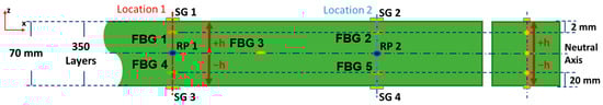 Understanding the curing behavior of thick ComBeams with uniform or varying material thicknesses during the compression molding is critically important due to the potential occurrence of an exothermic reaction and non-uniform heat transfer within the material system. FBG sensors are highly effective in measuring temperature, strain, and internal stress distribution. These sensors provide valuable insights into the complex physics of the curing process, including resin gelation, solidification, and shrinkage, which ultimately lead to the development of internal stress [,,,].