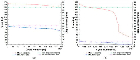 The first phase is characterized by a pronounced non-linear decrease in stiffness, primarily driven by the rapid development of matrix cracks. This typically occurs within the initial 15–25% of the fatigue life []. This stage, depicted in Figure 19a, corresponds to the initial cycles during which ComBeam 5 experiences a decline in both maximum and minimum forces, likely due to factors such as matrix cracking, residual curing stresses, and voids or inconsistencies in the composite material.