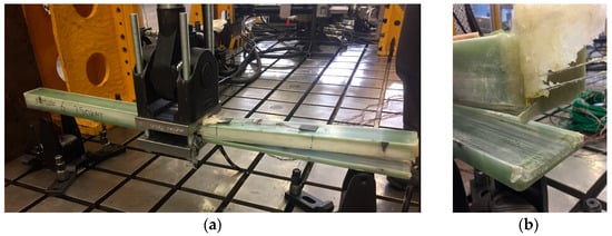 In contrast, the fatigue characteristics of ComBeam 6, illustrated in Figure 19b, enter this phase after only 1107 cycles. This highlights that larger displacement amplitudes, even at a lower frequency of 0.5 Hz, notably accelerate the onset of critical damage. This rapid progression to failure, as seen in Figure 20, contrasts with ComBeam 5, which successfully endures the entire range of tested cycles without failure.