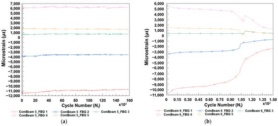 Microstrain response of FBG sensors embedded in (a) ComBeam 5 and (b) ComBeam 6.