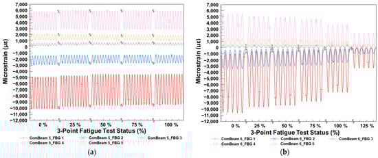FBG strain measurement data captured at quarter-based percentages of the fatigue tests for (a) ComBeam 5 and (b) ComBeam 6.