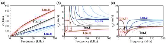 Dispersion curves of pipe UGWs: (a) wavenumber k, (b) phase velocity cp, (c) group velocity cg (n = 0–4).