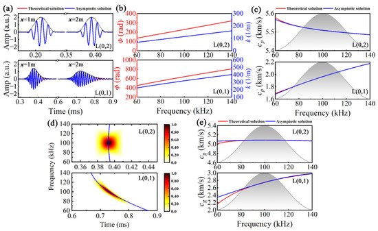 Subsequently, the phase difference Φ(f) between the asymptotic and the excitation signal was calculated, and wavenumber and phase velocity were obtained by k(f) = Φ(f)/x and cp(f) = f/k(f), as illustrated in Figure 2b,c, where the gray gradient area represents the excitation spectrum. Additionally, both time–frequency distribution and instantaneous frequency IF(t) were derived using the pseudo-Wigner–Ville transform. Furthermore, by converting from the time axis to the group velocity axis using cg = x/t, the group velocity dispersion curves were obtained, as shown in Figure 2d,e. It can be inferred that there exists substantial alignment between asymptotic and theoretical solutions across various parameters, including time domain signals, k, cp, and cg, thus indicating the efficacy of this model as a supersonic UGW propagation model.