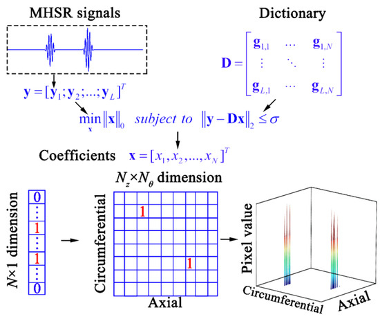 In addition to the conventional UGW anomaly imaging methods mentioned in the introduction, sparse reconstruction imaging, inspired by the sparse reconstruction method, represents an effective enhancement in resolution. Xu et al. [43] proposed an anomaly imaging method based on weighted sparse reconstruction, which obtains pixel values at each position in the imaging area by solving the weighted sparse reconstruction problem. For a better understanding of the principles behind sparse reconstruction imaging, its process is illustrated in Figure 4.