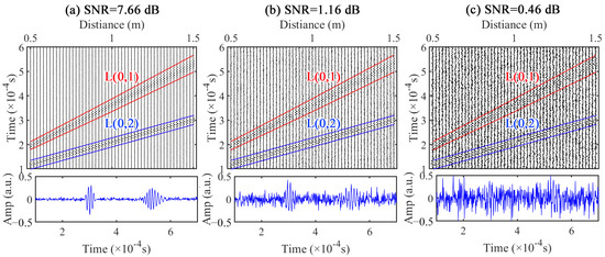 The synthetic spatial–temporal signals were constructed using NDM, incorporating L(0,2) and L(0,1) modes. The spatial measurements were set to 50 with a measurement spacing of 0.02 m, and the initial measured position was at 0.5 m. Gaussian white noise was introduced to the synthetic spatial–temporal signal to generate noisy signals with different SNRs, as depicted in Figure 5, where the lower blue signal represents the time domain signal of the final measured position. As the measurement position advanced, the propagation distance of the UGW increased, leading to a gradual diffusion of energy in the time domain for the dispersive L(0,1) mode with weak dispersion, resulting in temporal broadening of the wave packet. Conversely, for L(0,1) with weak dispersion, there is minimal change observed in wave packet width. Additionally, when SNR decreases to 0.46 Db, both L(0,2) and L(0,1) gradually become indistinguishable amidst non-coherent noise.