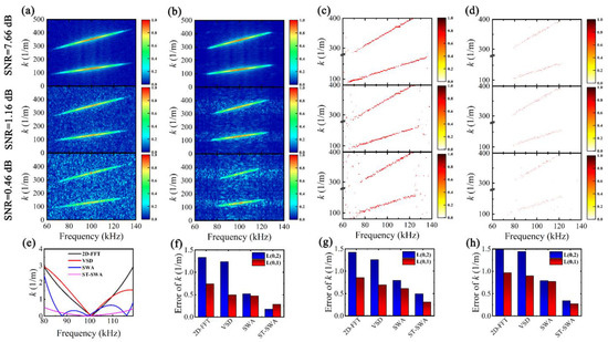 k-f distribution of noisy time–space signals: (a) 2D-FFT, (b) VSD, (c) SWA, and (d) ST-SWA; (e) estimated error of k(f) at L(0,2) for SNR = 7.66 dB, and the average estimated error of k(f) at different SNRs: (f) SNR = 7.66 dB, (g) SNR = 1.16 dB, and (h) SNR = 0.46 dB.