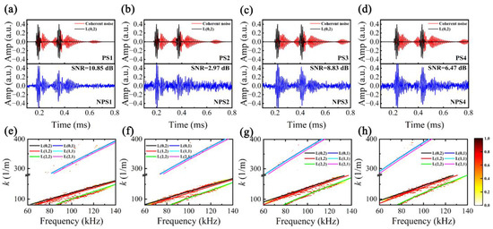 Considering potential deviations between the actual k(f) and its theoretical value, it is imperative to conduct a dispersion perturbation analysis to validate the efficacy of the MHSR. NDM (Formula (1)) was employed to synthesize multi-mode dispersive UGW signals encompassing L(n,m) (n = 0–2, m = 1–2), with an energy ratio of 0.88:0.12, and the propagation distances of d1 = 1 m and d2 = 2 m. Assume the dispersion perturbation parameter set is , where , and the perturbated coefficient δ is set to 0.1, 0.05, −0.05, and −0.1, respectively. By introducing random Gaussian noise as non-coherent noise, noisy perturbated signals (NPS1–NPS4) were generated, as illustrated in Figure 7a–d. Utilizing ST-SWA, the k(f) of NPS1–NPS4 were estimated and are illustrated in Figure 7e–h. The figure demonstrates that the resolution of different modes is correlated with their energy in the time domain. Due to the low signal amplitude of L(n,1) in the time domain, which is nearly overwhelmed by non-coherent noise, its peak ridge resolution is notably limited. The k(f) of L(0,2), exhibiting the highest energy in the time domain and superior resolution, was isolated for extraction and subsequent calculation of its perturbated coefficient. Assuming that other modes share a similar disturbance coefficient as L(0,2), we obtained estimated k(f) for all modes, as depicted in Figure 7e–h. The results indicate a high consistency between the estimated k(f) and trends observed in the peak ridges within the k-f distribution.