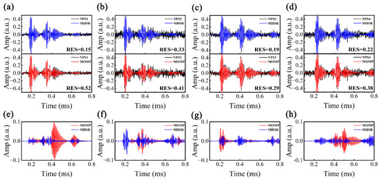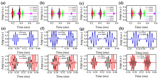 Non-dispersive components of MHSR signals: (a) NPS1, (b) NPS2, (c) NPS3, and (d) NPS4; dispersion compensated signals by MHSR and MOMP: (e) NPS1, (f) NPS2, (g) NPS3, and (h) NPS4.