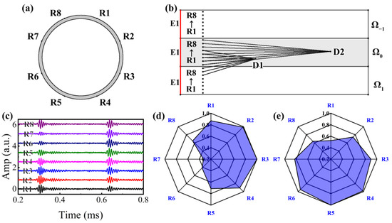 Considering that the excitation of L(0,2) needs to be achieved through the form of circumferential full coverage, only one excitation sensor is needed. Eight receiving sensors R1–R8 (π/16–15π/16) are evenly distributed along the circumference, as shown in Figure 10a. For the convenience of displaying the imaging results, the cylindrical coordinate system of the pipe is transformed from (r, θ, z) to the cartesian coordinate system (z, rθ). Assuming that the defect is located at the axial and circumferential positions of dz and dθ, the propagation distance of UGW from the excitation to the defect to Ri can be calculated by .